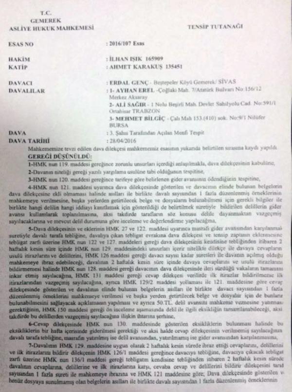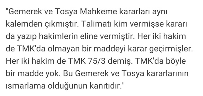 "Gemerek ve Tosya Mahkeme kararları aynı kalemden çıkmıştır. Talimatı kim vermişse kararı da yazıp hakimlerin eline vermiştir. Her iki hakim de TMK'da olmayan bir maddeyi karar geçirmişler. Her iki hakim de TMK 75/3 demiş. TMK'da böyle bir madde yok. Bu Gemerek ve Tosya kararlarının ısmarlama olduğunun kanıtıdır."