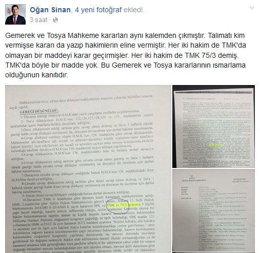 MHP Genel Başkan adaylarından Sinan Oğan, Gemerek ve Tosya Mahkemelerinin verdiği kararın tek elden çıktığını iddia ederek Facebook'tan şu ifadeleri kullandı: