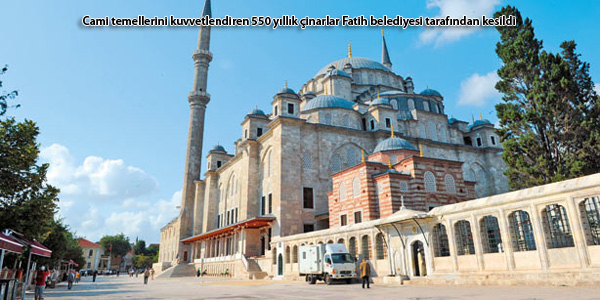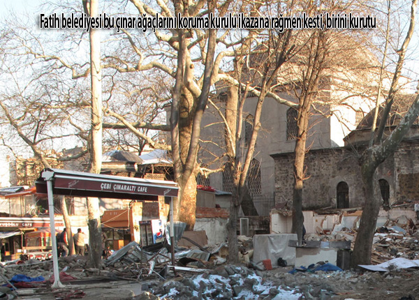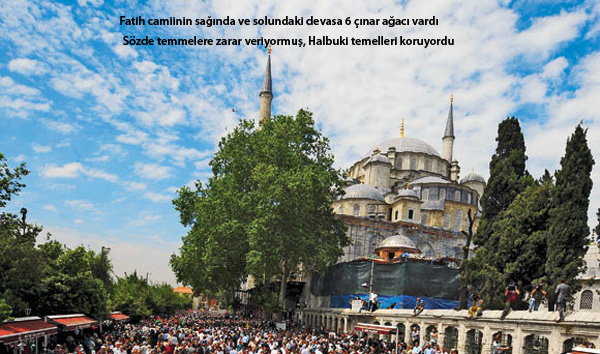 Fatih camisi yapıldığında Zemin sarı kum gibi bir toprak olmasından dolayı herhalde caminin sağına ve soluna üçer tane çınar dikilmiş, 550 yaşındaki bu dev çınarlar bir gece kimseye sormadan Sırf caminin görüntüsü açılsın diye kesildi, Böyle gece yarısı tarihi anıt çınarların kesilmesi demokratik bir ülkede olabilir mi?