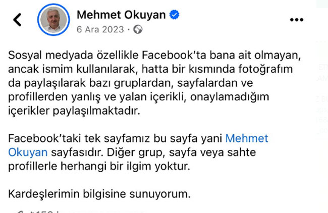 Bu fırsatçılardan birçoğu akademik dünyamızın popüler isimlerinden Prof. Dr. Mehmet OKUYAN / Ondokuz Mayıs Üniversitesi İlahiyat Fakültesi Tefsir Anabilim Dalı öğretim üyesi. Sayın Okuyan’a whatsAp üzerinden adına açılmış bir sayfada yapılan İslam düşmanlığından söz ettim, Kendisi bu gurupları kuranları “Mahkemeye verdim ama sonuç alınamıyor. Ben de Tv. Programlarımda bunların sahte hesaplar olduğunu söyledim de yazdım da, Başka ne yapılır bilemiyorum” diyerek şikâyetini dile getirdi.