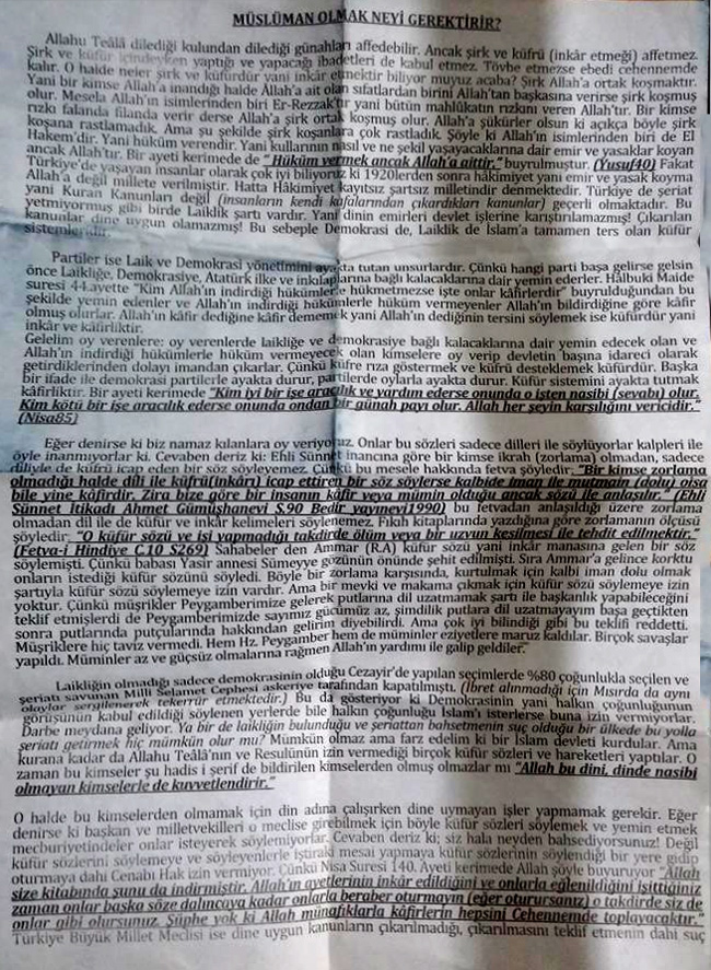 Kimliği belirsiz kişiler tarafından İstanbul Fatih ilçesinde yılbaşı günü laikliğin ve demokrasinin Allah'ın hükmüne karşı gelmek olduğunu ve bunları savunanların kâfir olduğunu belirten bildiriler dağıtıldı.