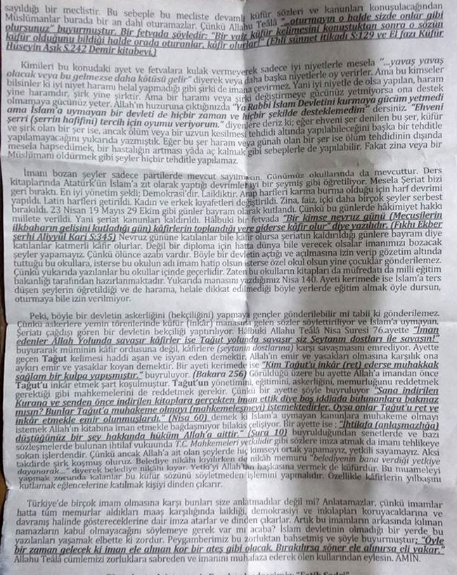 Laikliğin ve demokrasinin İslam'a ters olan küfür sistemleri olarak görüldüğü bildiride siyasi partilerin yemin törenlerinde Atatürk ilke ve İnkılaplarına bağlı kalacaklarına dair yemin etmeleri ve seçimlerde bu partilere oy verilmesi Allah'a küfür olarak tarif edildi.