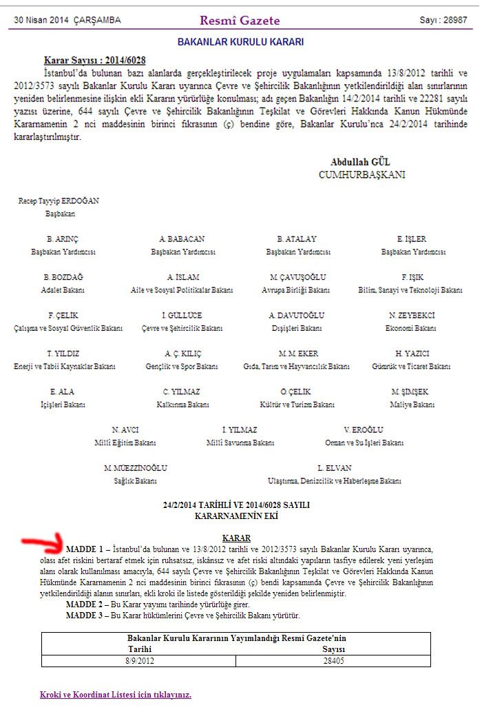 BAKANLAR KURULU KARARI | Karar Sayısı : 2014/6028 İstanbul’da bulunan bazı alanlarda gerçekleştirilecek proje uygulamaları kapsamında 13/8/2012tarihli ve 2012/3573 sayılı Bakanlar Kurulu Kararı uyarınca Çevre ve Şehircilik Bakanlığının yetkilendirildiği alan sınırlarının yeniden belirlenmesine ilişkin ekli Kararın yürürlüğe konulması; adı geçen Bakanlığın 14/2/2014 tarihli ve 22281 sayılı yazısı üzerine, 644 sayılı Çevre ve Şehircilik Bakanlığının Teşkilat ve Görevleri Hakkında Kanun Hükmünde Kararnamenin 2 nci maddesinin birinci fıkrasının (ç) bendine göre, Bakanlar Kurulu’nca 24/2/2014 tarihinde kararlaştırılmıştır. |