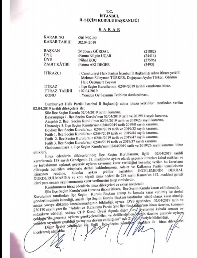 iptal edilen oyların yeniden değerlendirilmesi ve birleştirme tutanaklarına ilişkin itirazda bulunmuş, itirazlar, İl Seçim Kurulunca; reddedilmişti.