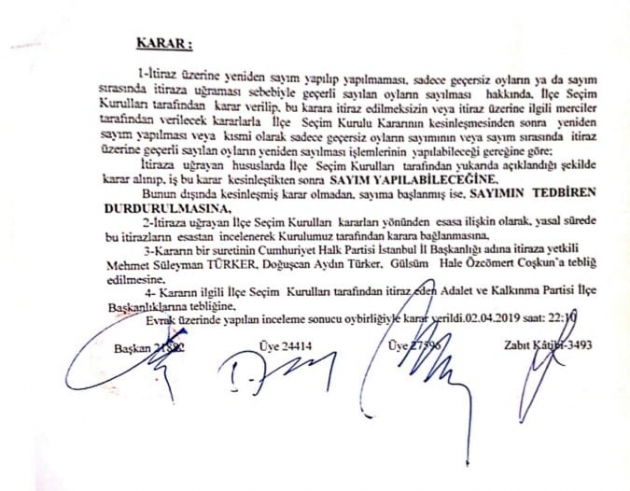 “İlçe Seçim Kurumu, İl Seçim Kurumu’nun kararı kesinleşmeden biz sayım yapamayız dedi. İtirazların İl Seçim Kurumundan YSK’ya gidip İlçe Seçim Kururulu’na kararın gelmesiyle kesinleşir dediler. Bu karar kesinleşmeden bu sayımı yapamam diyor. Bu da iki gün sürüyor… Kesinleşmiş itirazların olmadığı durumlarla da ilgili sayım yapamayacaklarını söylüyorlar. Sayım kararını aldılar fakat daha sonra İl Seçim Kurumu bu kararı almadan sayamam diyerek kararını değiştirdi. Yanlış bir uygulama yaptıkları için belki de bir uyarı aldılar. Benim verdiğim karar kesinleşmeden sayamazsın diyorlar. İşlemleri olduğu gibi durdurdular şuan hiç bir değişiklik yok.