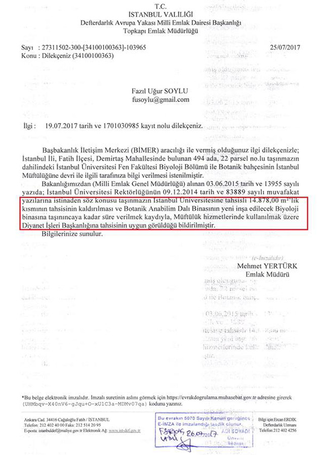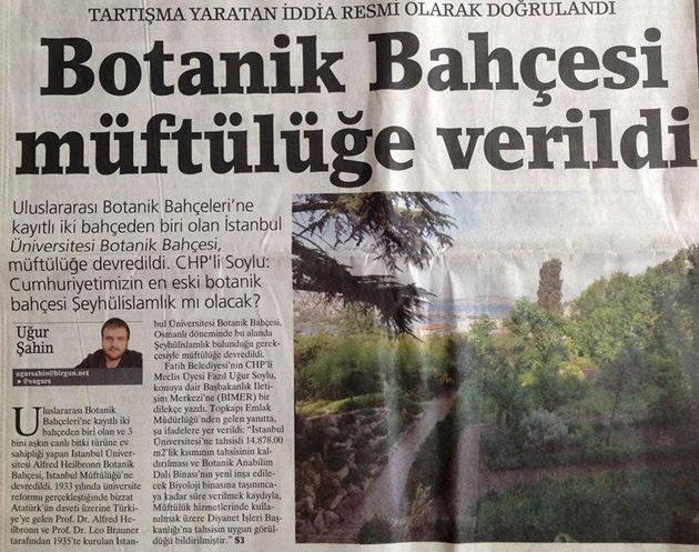 Sur içindeki kamu mülkleri bir bir otel olurken İstanbul Üniversitesi Botanik bahçesi İstanbul il müftülüğüne devredildi, Vakıf mülklerinde olduğu gibi Bu şekilde sesiz sedasız el değiştirmesi mümkün olacaktır diye endişelerimiz var