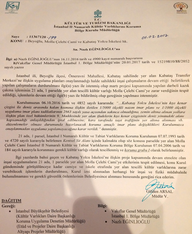 Merhaba, rnrnDün kurulla konuştum. Vakıflar müdürlüğü kurumu, kurula kazık çakma sebebiyle Molla Çelebi camisinde zarar oluştuğuna dair şikâyette bulunmuş. Kurul da çalışmanın durdurulması için ibb ye yazmış. Bize gelen bu yazıymış. rnrnAncak daha sonra Vakıflar camide zarar oluşmadığına dair bir açıklama yapmış. Bu nedenle kazıkların çakılmasına devam ediliyormuş. rnrnBu arada projenin neden ibb de askıya çıkmadığını da öğrendim. 2008 de kurulun onayladığı projeye uygun inşaat yaptıklarını söylüyorlarmış. rnDenetim görevi de ibb deymis. rn2008 deki projenin bu kadar büyük çaplı olduğu düşünmüyorum. Kaldı ki o proje askıya çıkmış miydi?rnBu konuda bilgisi olan yorum yaparsa seviniriz