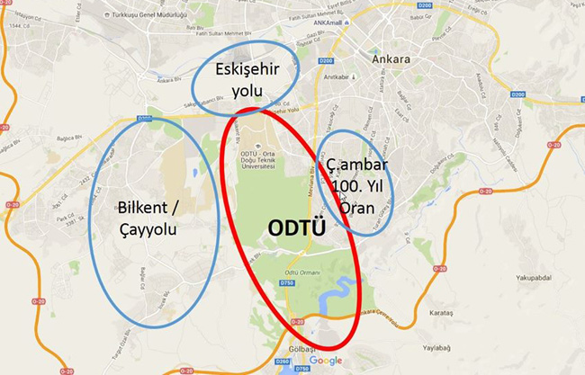 Şimdi; ODTÜ’nün toplam alanı yaklaşık 75 bin dönümmüş. Maviyle işaretlediğim Ankara’da yüksek katlı lüks yapılaşmanın en yoğun olduğu yerler ve dolayısıyla en kıymetli alanları. Eyvah arada da çiğ yeşil bir tatak kalmış!