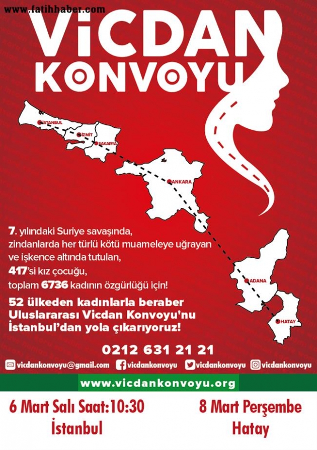 Suriye’de 7 yıldır devam eden savaşta hapsedilen, işkence ve kötü muamele gören kadınlara dikkat çekmek ve özgürlüklerini talep etmek için oluşturulan Uluslararası Vicdan Konvoyu 6 Mart’ta İstanbul’dan yola çıkıyor. Türkiye’den kadınların öncülüğünde 55 ülkeden farklı din, dil, ırk ve kültürlerden kadınların yola çıkaracağı ve 8 Mart Dünya Kadınlar Günü’nde Hatay’dan dünyaya seslenecek olan konvoya binlerce kadın katılacak.