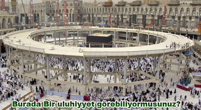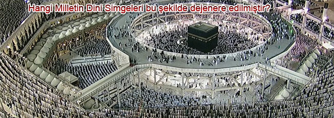 Şimdi bu hastalık, duyarsızlık kıblemiz kabenin duvarlarına sıçradı, yeniden, adeta sirk gibi acaip bir hale dönüştürülen kutsal kabenin etrafındaki duvarlarda Allah lafzının üzerine konulması adet olan Hilal yerine put şeklinde haç işareti işlendiğini görüyoruz.