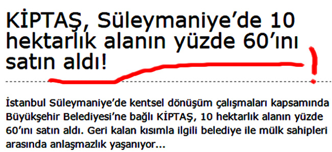 İstanbul Süleymaniye’de kentsel dönüşüm çalışmaları kapsamında Büyükşehir Belediyesi’ne bağlı KİPTAŞ, 10 hektarlık alanın yüzde 60’ını satın aldı.