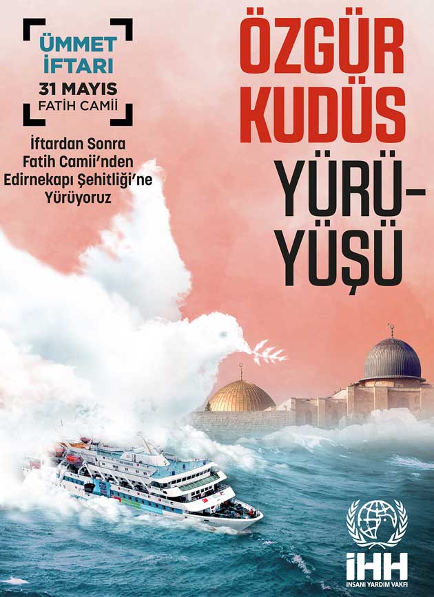 İHH İnsani Yardım Vakfı’nın çağrısıyla Filistin gönüllüleri, 31 Mayıs 2019 Cuma günü Mavi Marmara katliamının yıl dönümünde düzenlenecek olan Özgür Kudüs Yürüyüşü için Fatih Camii’nde Ümmet İftarı’nda bir araya gelecek. İftarın ardından meşalelerle Edirnekapı Şehitliği’ne yürünecek.