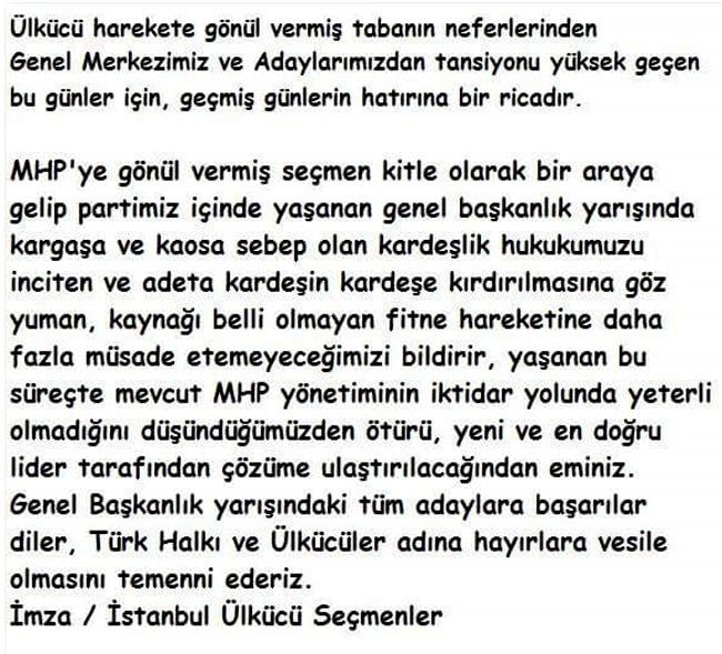 Öncelikle bu toplantıda MHP seçmenleri olarak gündemimizi parti içinde yaşanan Tüzük ve genel başkanlık yarışında kargaşa ve kaosa sebep olan söylemlerin yumuşatılması MHP için iktidar yolunda karşımıza çıkacak engellerin aşılmasıda mevcut yönetimin yeterli olmadığını, Ülkücü Tabanın ve Türkiye seçmenlerinin ortaya koyduğu yeni iradeye fırsat verilmesini düşündüğümüzden dolayı, Delegelerin-Halkın teveccüh ettiği, en doğru bir lider ve kadrosu tarafından çözüme ulaştırılacağına inanıyoruz.