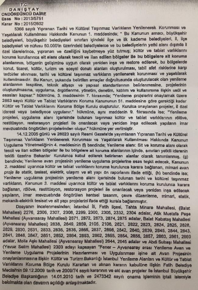 Derneğimizin ve TMMO avukatlarının İdare mahkemedinde itiraz ederek kazandığı, Kamu menfaati yoktur şeklinde bir karar ile iptal edilen Fener Balat Ayvansaray Yenileme (Dönüşüm) projesine Fatih belediyesi itiraz ederek Danıştayda dava açmıştı.