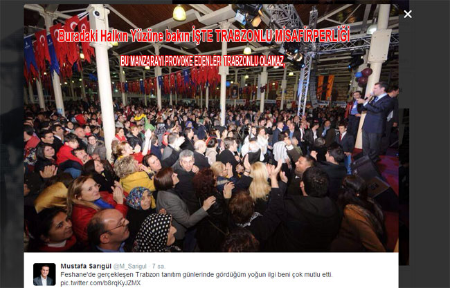 Sarıgül Trabzonluların kendisine gösterilen misafirperliğe teşekkür ederken, Seçim yarışı hakkında bir kısa durum zikretti, Asla akp yi dışlayıcı kötü söz kullnmadı, seçim yarışında 1. olduğunu anlatmak isterken birilerinin tahammülü zorlamış olmalı ki Trabzona Trabzonluya yakışmayan tezahüratla susturulmaya çalışıldı.