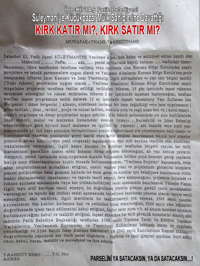 İktidarın bu şekilde dayatmalarla, Taahhütname adı altında mülk sahiplerinin Mülkiyet hakkını ellerinden alan uygulamaları asla yapmamalarını, mutlaka iyi bir avukat tutarak haklarını savunmalarını istedi,