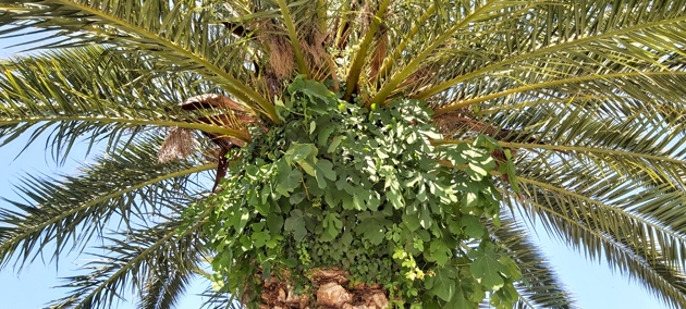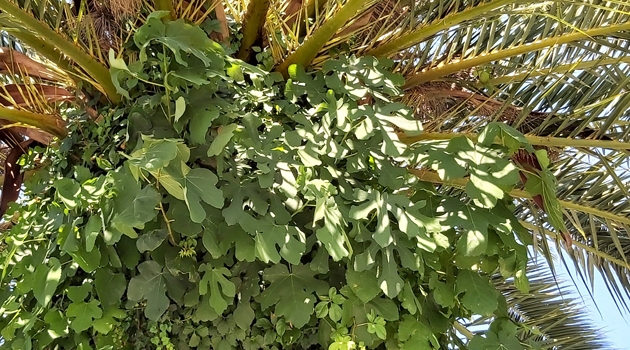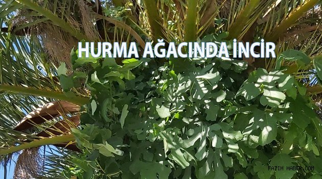 Devasa Bağdat Hurması ağacının dalları arasından incir dalları fışkırıyor.