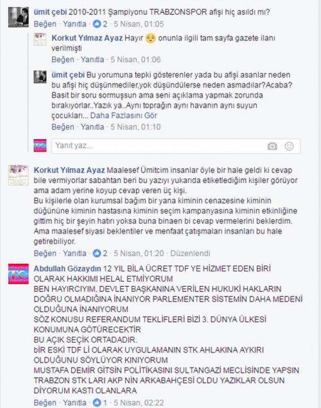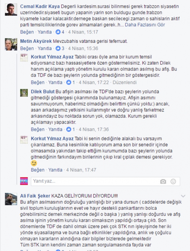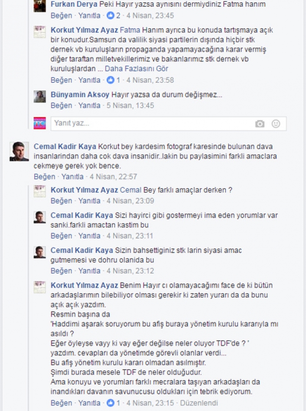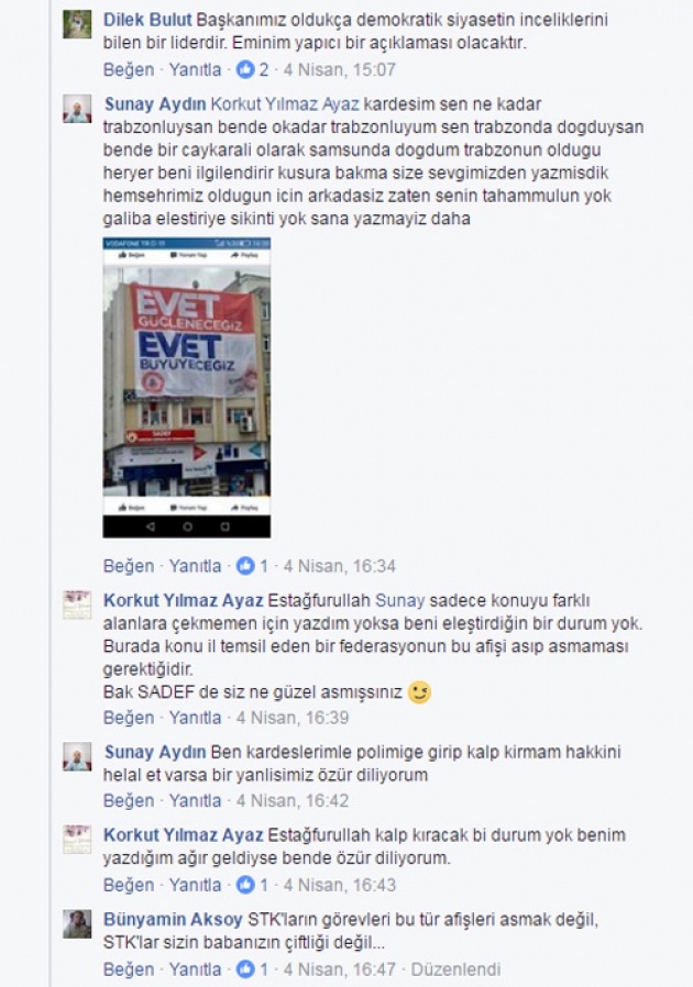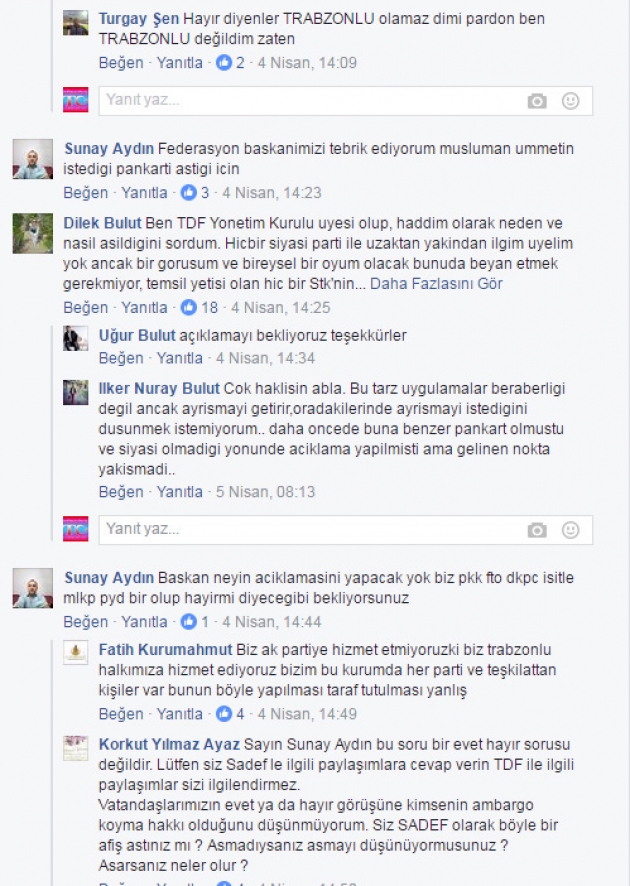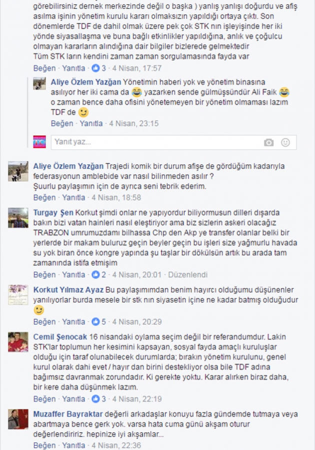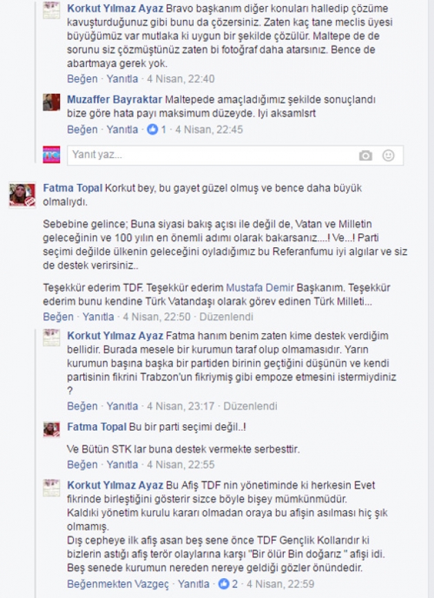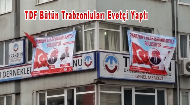 07/04/2017 akşam üstü TDF Gençlik kolu başkanı İbrahim Akın’ın TDF Camlarındaki Evet pankartını indirdiğini gördük, Fakat hemen ardından bu cephelere 14 Nisan günü Sinan Erdem spor salonunda Bakan Süleyman Soylu ve Berat Albarak’ın katılacağı ilan edilen Siyasi Evet konferansı afişi asılması TDF yöneticilerinin Trabzonluları hiçte ciddiye almadığının göstergesi oldu.