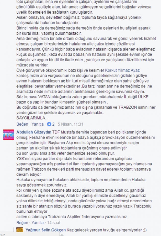 bu kurum ;Trabzonlu Dernekler den teşekkül çatıdır.O halde Delege ve Dernek Başkanlarından oluşan Başkanlar kurulunu malum gündemle toplantıya davet eden yönetim yok! Peki olması gereken istişareyi siz dahil yöneticilik ve yahut ilgili tüm derneklerle bir toplantı kaçınılmazdır. Derneklerimizi Siyasi emellere artık basamak kullandırtmayalım. Referandum sonrası bu konu gündemimizdedir.