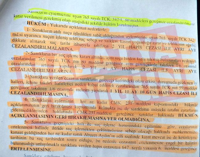 Kararın hüküm bölümünde ise sanıklara 1 yıl 11 ay 10 gün hapis cezası verildiği belirtilirken, hükmün açıklanmasının geri bırakılmasına yer olmadığına ve cezanın ertelenmesine karar verildiği kaydedildi.