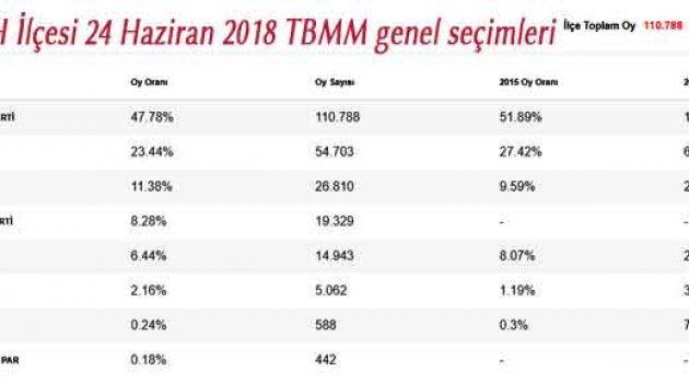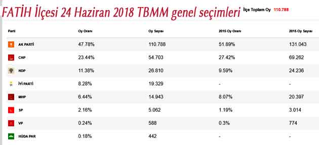 Bu arada Fatihte aktif muhalefette hiçbirşey yapmayan MHP, SP, HDP, VP oyunu arttırmış görülüyor. İlk seçimine giren İYİ parti 19.329 oyla %8.28 oy aldı.