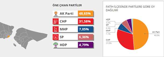 FATİH 2014 YEREL SEÇİM SONUÇLARI | OY ORANI | TOPLAM OY | AK PARTİ - Adalet ve Kalkınma Partisi | 48,6 | 122.656 | CHP - Cumhuriyet Halk Partisi | 31,6 | 79.646 | MHP - Milliyetçi Hareket Partisi | 7 | 17.773 | SP - Saadet Partisi | 6,4 | 16.018 | HDP - Halkların Demokratik Partisi | 4,8 | 12.077 |