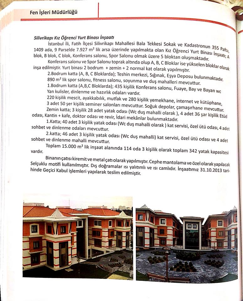 İnşaat mahalline asılan tabelada, Yapı sahibinin Fatih Belediye Başkanlığı olan, Ruhsatı İmar ve Şehircilik Müdürlüğü tarafından verilen, Silivri Kapı Mahallesinde 1409 ada, 355 pafta, 9 parselde 15.000m2 inşaat alanı olduğu beyan edilen Kız Öğrenci Yurdu İnşaatı adı ile;