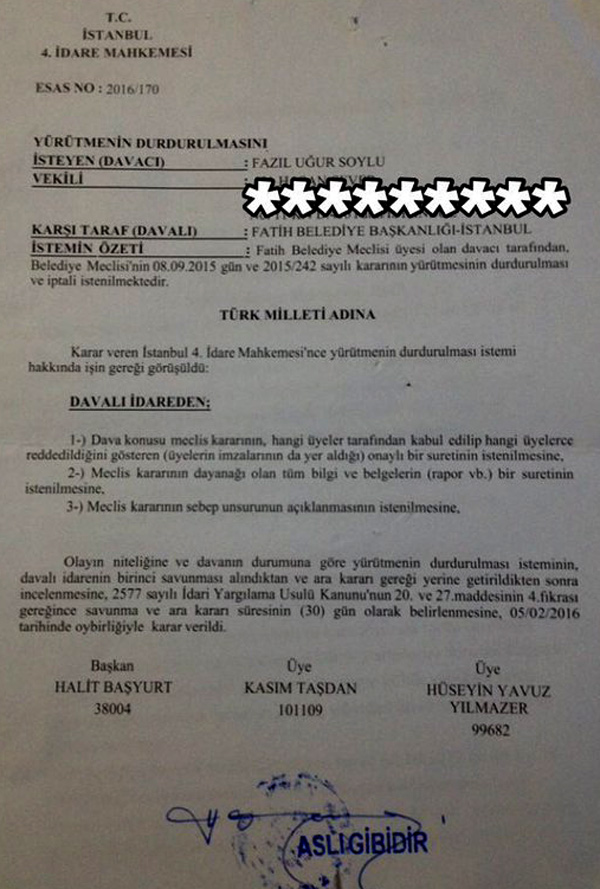 Fazıl Uğur SOYLU; Koruma Kurulunu devre dışı bırakan kararın yürütmesini durdurma ve iptali için açtığım davayı mahkeme kabul etti.