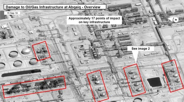 Aramco saldırısına dair uydu görüntüleri yayımlayan Washington: Geliş yönü Yemen değil, İran'ın işi olduğuna şüphe yok.. The New York Times, ABC ve Reuters'e konuşan Trump yönetiminden yetkililer, Suudi Arabistan'ın doğusundaki iki petrol tesisine yönelik saldırıların yönü ve çapının, Husi işi olmadığına işaret ettiğini söyledi. ABD'li yetkililer, "İran'ın sorumlu olduğuna şüphe yok. Ne derseniz deyin, başka aday yok" iddiasında bulundu.