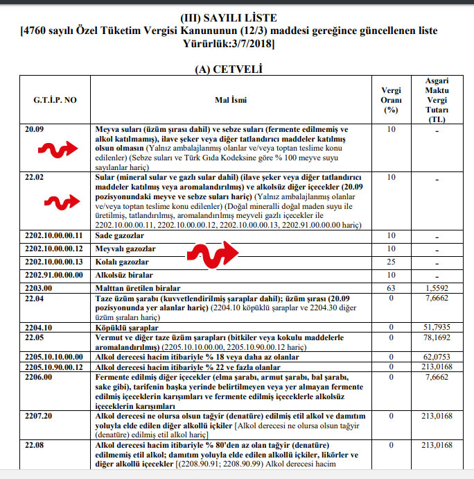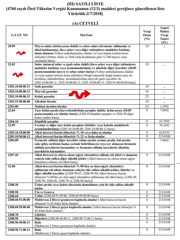 Bugün yayınlanan güncel özel tüketim vergisi uygulanan ürünler listesine “sular (mineral sular ve gazlı sular dahil) (İlave şeker veya diğer tatlandırıcı maddeler katılmış veya aromalandırılmış)” ifadesinin eklendiği farkedildi.