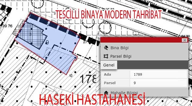 Haseki Hastahanesinin köşesinde bulunan 9 parsel üzerindeki SMÖ Tescilli binanın parselinin büyük bir bölümü Haseki hastahanesi tarafından işgal edilmiş görülüyor.