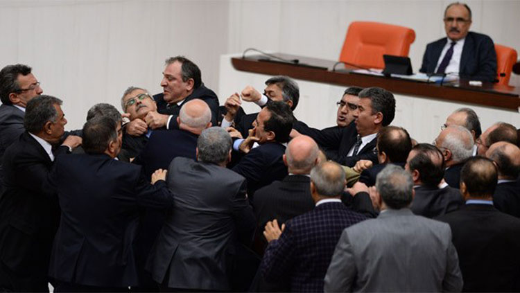 AK Partili İdare Amiri Ömer Faruk Öz, yanına gittiği Tezcan’la konuşarak kürsüyü terk etmesi için ikna etmeye çalışırken yaklaşık 10 Ak Parti milletvekili de kürsü önünde toplandı. Bu sırada Başkanlık Divanı’ndan inen AK Partili Katip Üye, Burdur Milletvekili Bayram Özçelik, Tezcan’a arkasından sarıldı ve savurarak kürsüden uzaklaştırdı. Tezcan dengesini kaybederken yerlerinden fırlayan CHP’liler de arbedeye girdi.