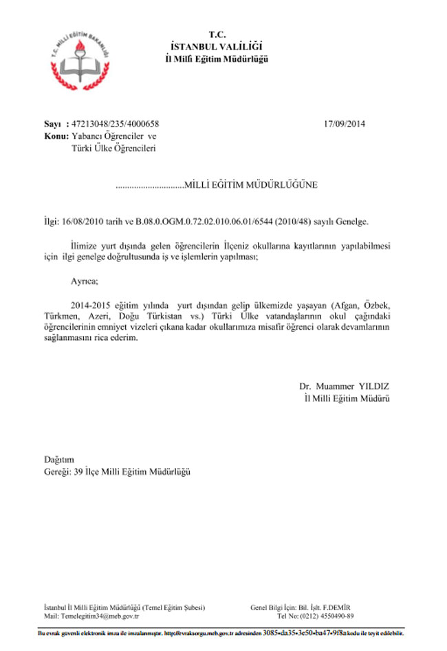 İstanbul Milli Eğitim Müdürlüğü, geçtiğimiz yıl olduğu gibi 2014-2015 öğretim yılında da Türkistanlı öğrencilerin okullara kayıt yaptırabilmeleri için 39 ilçe Milli Eğitim Müdürlüğüne bir genelge gönderdi.Okullar 15 Eylül Pazartesi itibariyle öğretime başladığı için, bütün Türkistanlı hemşehrilerimizin okul çağına gelmiş çocuklarının kayıt işlemlerini yaptırmaları önemle duyurulur.
