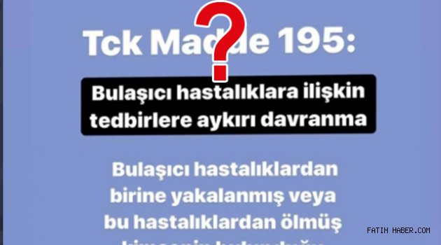 COVIT-19 Korona virüsü karantina tedbirlerine uymayanlarla ilgili TCK'nin 195. maddesinde "Bulaşıcı hastalıklardan birine yakalanmış veya bu hastalıklardan ölmüş kimsenin bulunduğu yerin karantina altına alınmasına dair yetkili makamlarca alınan tedbirlere uymayan kişi, iki aydan bir yıla kadar hapis cezası ile cezalandırılır."