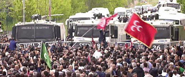 Çok kalabalık ve araçları 7 km uzakta bırakıp yaya gelebildik ancak. Bahçeli istifa sesleri yeri göğü inletiyor.