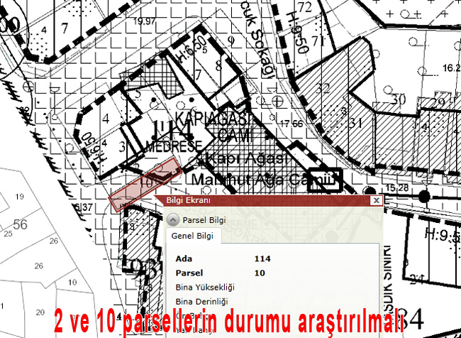 Kapıağası Mahmut ağa Medresesine ait olduğu görülen 114 ada 2 ve 10 parseller Tescilli olması gerektiği halde Tescili kaldırılmış, Boş parsel olarak gösteriliyor.