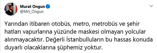 Cumhurbaşkanı RT. Erdoğan’ın, toplu alanlarda maske takılmasının zorunlu olacağını açıklamasının ardından, İstanbul ve Ankara Büyükşehir Belediyeleri yarından itibaren maskesi olmayanların toplu taşıma araçlarına alınmayacağını açıkladı.