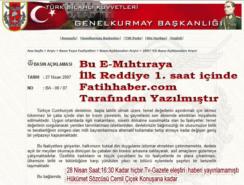 27 Nisan 2007 tarin saat: 11.15 ' de yayınlanan E-Mıhtıra metni için tıklayınız