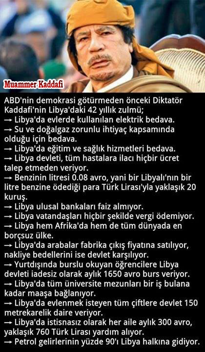 Ben libyada yaşadım yemin olsun bu yazılanların hepsı doğru kaddafi dikdatör değildir bu amerikanın bir uydurmasıdır.