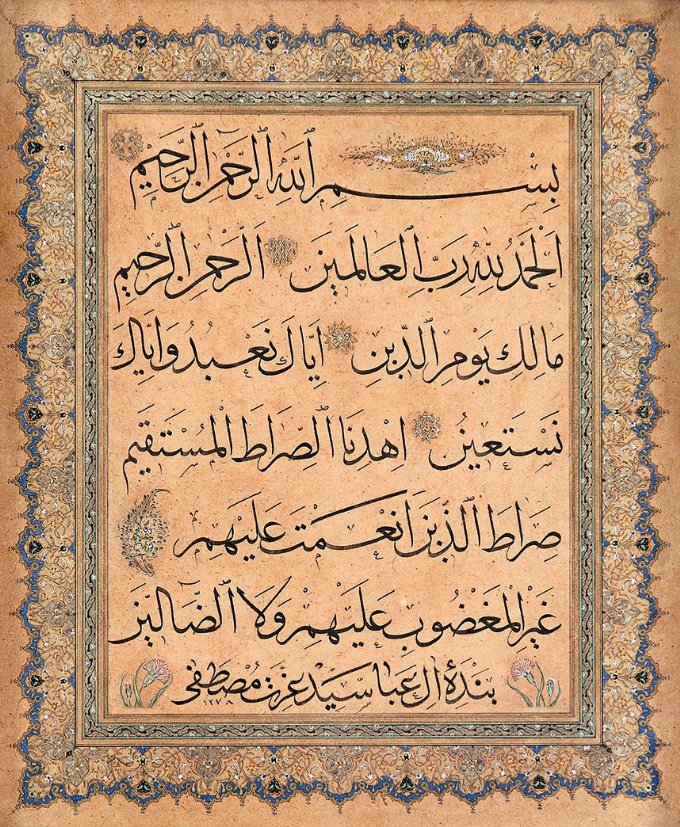 "Elhamdü lillâhi rabbil’alemin. Errahmânir’rahim. Mâliki yevmiddin. İyyâke na’budü ve iyyâke neste’în, İhdinessırâtel müstâkim. Sırâtellezîne en’amte aleyhim ğayrilmağdûbi aleyhim ve leddâllîn."