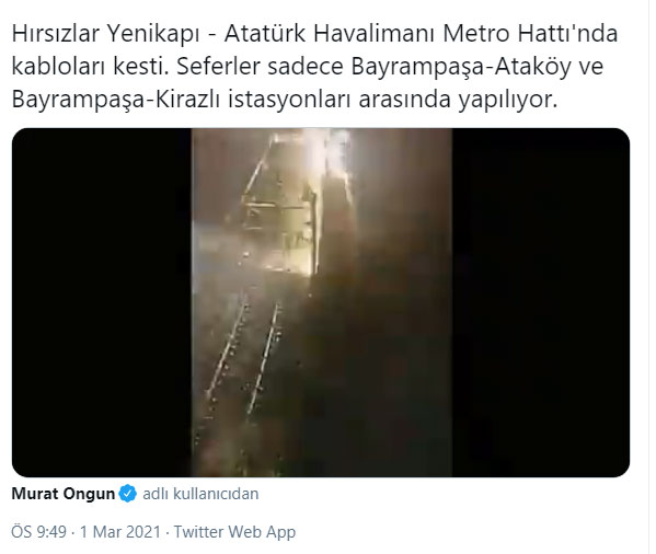 Hırsızlar Yenikapı - Atatürk Havalimanı Metro Hattı'nda kabloları kesti. Seferler sadece Bayrampaşa-Ataköy ve Bayrampaşa-Kirazlı istasyonları arasında yapılıyor.
