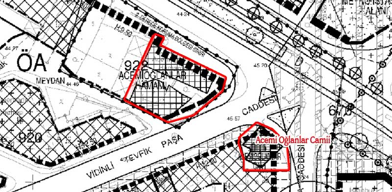 Vidinli Tevfikpaşa caddesi cepheli 918 ada, 46 parselde 2005 planlarında görülen Acemi Oğlanlar Camii 2012 planlarında yok edilmiş olduğunu görüyorsunuz.