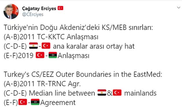 Dışişleri Bakanlığı İkili Siyasi İşler ve Denizcilik-Havacılık-Hudut Genel Müdür Vekili Büyükelçi Çağatay Erciyes, geçen hafta Türkiye ile Libya arasında imzalanan Deniz Yetki Alanlarının Sınırlandırılmasına İlişkin Mutabakat Muhtırası'ndan sonra Türkiye'nin Doğu Akdeniz'deki kıta sahanlığı ve MEB sınırlarını gösteren haritayı sosyal medyada paylaştı.