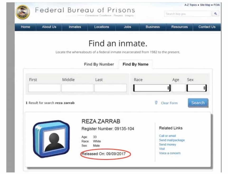ESKİ TARİHLİ PAYLAŞIMININ ALTINDA ABD FEDERAL CEZAEVLERİ BÜROSU NUN İNTERNET SİTESİNDE REZA ZARRAP IN TAHLİYE EDİLDİĞİ BELİRTİLMİŞ