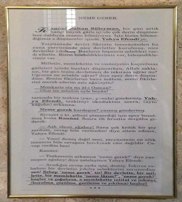 “Bir devlette zulüm yayılırsa, haksızlık sıradan bir hale gelirse, işitenler de neme lazım deyip uzaklaşırsa, sonra koyunları kurtlar değil de çobanlar yerse… Bilenler bunu söylemeyip susarsa ve gizlerse… Fakirlerin, muhtaçların, yoksulların, kimsesizlerin feryadı göklere çıkar, bunu da taşlardan başkası işitmezse… İşte o zaman devletin sonu görünür.