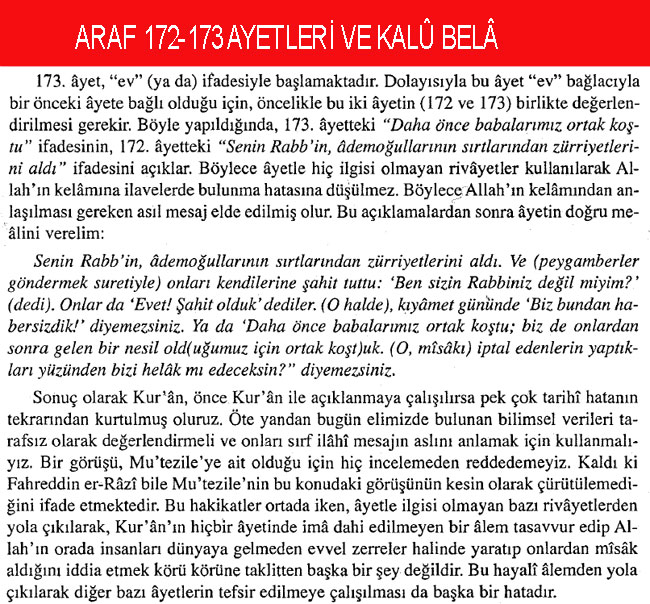 Araf 172: Rabbin Âdemoğulları’ndan zürriyetlerini alıp bunları kendileri hakkındaki şu sözleşmeye şahit tutmuştu: Ben sizin rabbiniz değil miyim? "Elbette öyle! Tanıklık ederiz" dediler.