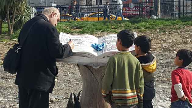 Eminönü Ahi Çelebi Camii'nin girişinde bulunan bilgilendirme yazısı hava şartlarından silinmiş ve okunmaz hâle gelmiş. Duyarlı bir amcamızda 'gençler geçerken okusun tarihini öğrensin' diyerek tahta kalemiyle yazının üzerinden geçiyor...