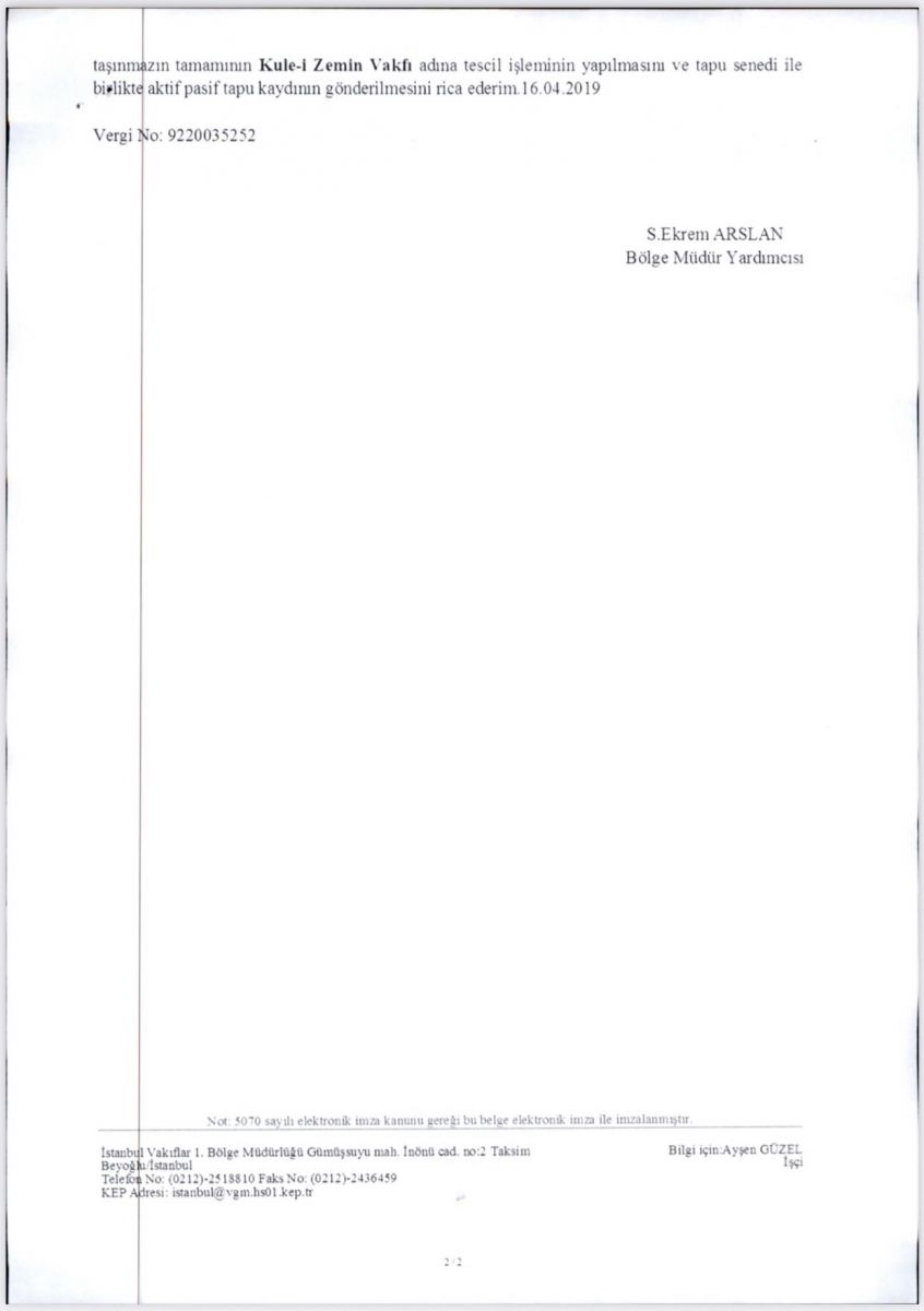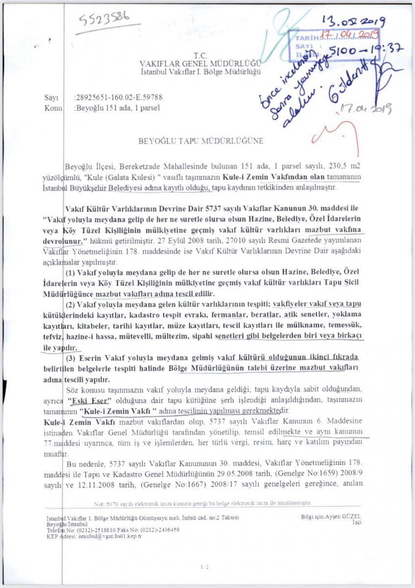 17 Nisan 2019 tarihinde Vakıfların yazdığı, hiç bir belge ve kanıt göstermeyen bu derin(!) tarihsel bilgi içeren yazıyla Galata Kulesi Vakıflara devredildi