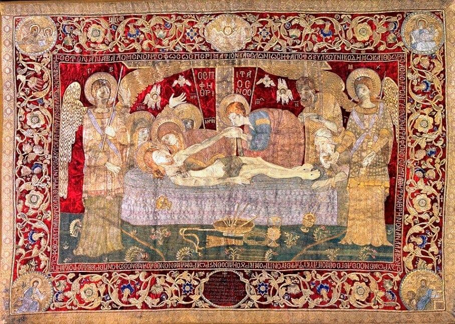 Επιτάφιος της Παναγίας Σουμελά . Είναι έργο της Θεοδοσίας του Κασυµπούρη και της µαθήτριάς της Ελισάβετ, κεντημένος στην Τραπεζούντα.