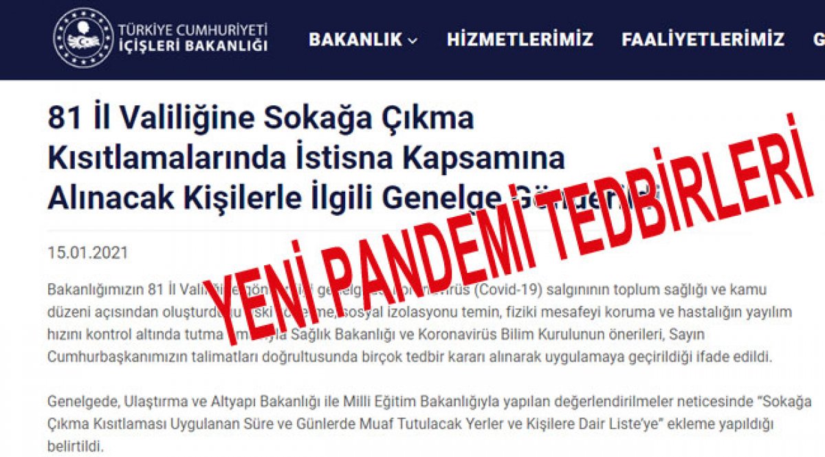 İç işleri bakanlığı 81 İl Valiliğine Sokağa Çıkma Kısıtlamalarında İstisna Kapsamına Alınacak Kişilerle İlgili Genelge Gönderildi 15.01.2021